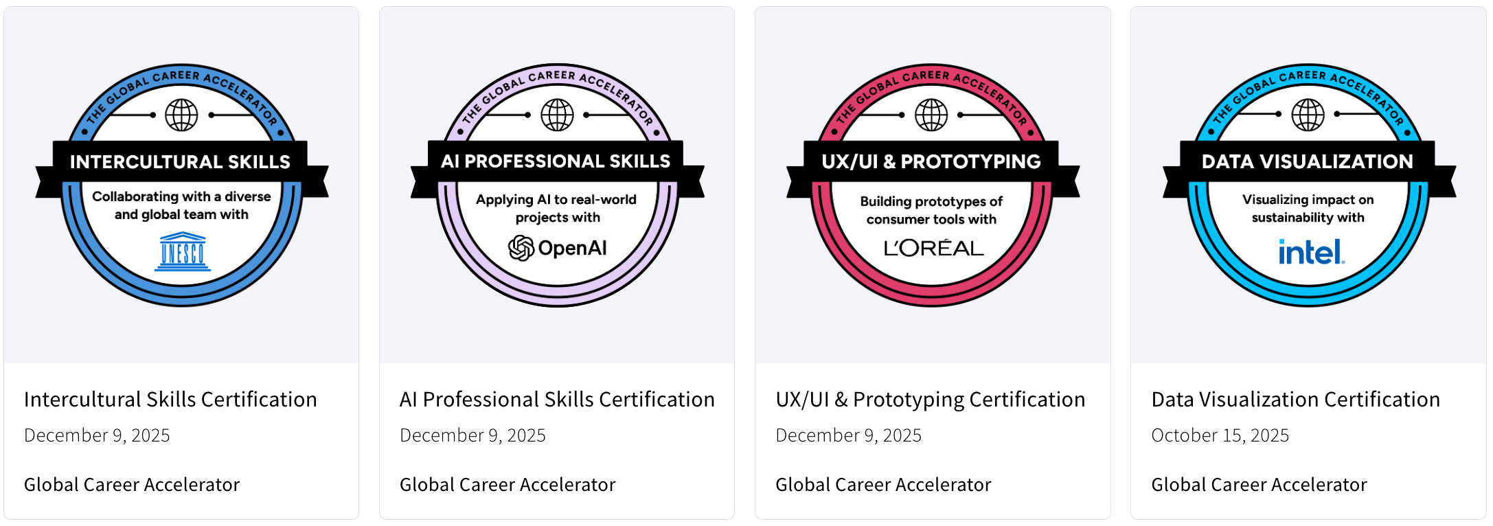 I completed my training with The Global Career Accelerator, where I earned four professional certifications in Intercultural Skills, AI Professional Skills, UX/UI and Prototyping, and Data Visualization. This experience provided me with a strong, practical foundation in data driven thinking, design, and emerging technologies, while also strengthening my ability to work effectively across cultures and disciplines. All certifications and credentials from this program can be found here: https://lnkd.in/eD-pnD5s